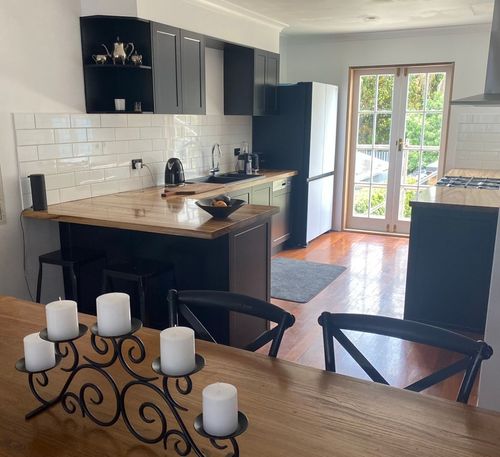 Thank you so much for posting those photos of your amazing kitchen transformation. The black cabinets really stand out and because you have so much natural light entering your kitchen from the new french doors, it balances out so beautifully. The camphor laurel benchtop is so warm and inviting, would you be able to tell us the process and paint you used to seal the timber benchtop? The door handles are an excellent accent to the doors.