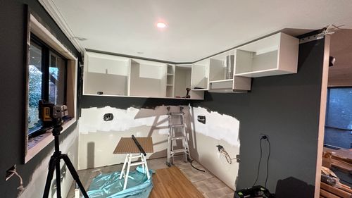 Paint areas of walls that will be exposed (no tile or cabinets) and install upper cabinets