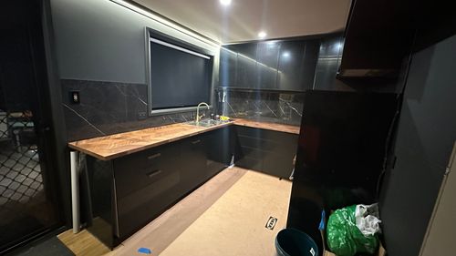 Install lower cabinets, bench tops and finish painting trim etc ready for tiling