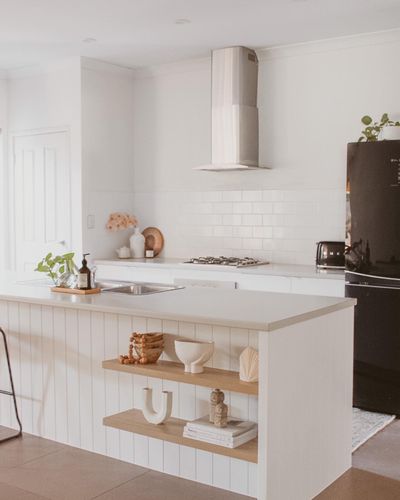 we gave our kitchen a much needed facelift by firstly painting the cupboards with the Dulux renovation rage. Adding easy craft panels to bench. We extending the sides of the bench so we could add the floating shelves to the front. We then continued that look by covering our exhaust with the easy craft panels and adding more timber floating shelves.