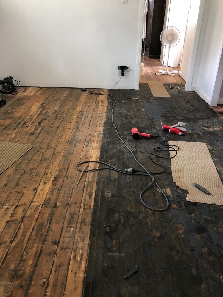 Before - removing the carpet and tar glue from the wood floorsBefore - removing the carpet and tar glue from the wood floors