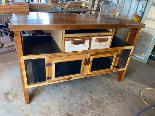 Hello Eric, I didn’t explain the FBI very well, sorry. It’s designed for the bbq area, although it lends itself to an island bench for the kitchen as well, especially the triple (which is what it was made for). The single is on castors so it can be moved closer to the bbq if needed. Has a drawer on both sides, and the cupboard underneath is reminiscent of meat safes, two doors back and front so it’s accessible both sides, enclosed with gauze. The idea being you can store the raw meat in it while the hot plate is readied, and then cooked meat etc can go in there until it’s ready to be eaten. I live in Thargomindah, Far SW Qld, flies are an issue😊 has a tea towel rack also. I was given some bench top off cuts, which is what I used for the top and determines the size of the FBI. Others I have made have timber tops. I’ll send photos of others I’ve built.