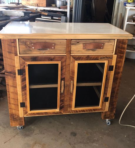 Your first cabinet really caught my eye, is that a recycled stone slab you've routered into the timber or is it just a very large tile that looks like a stone top? Would it be possible for you to post more photos of the cabinets you've built? Especially the first one as it looks very functional. Would you be able to tell us a bit about how these cabinets came to be?