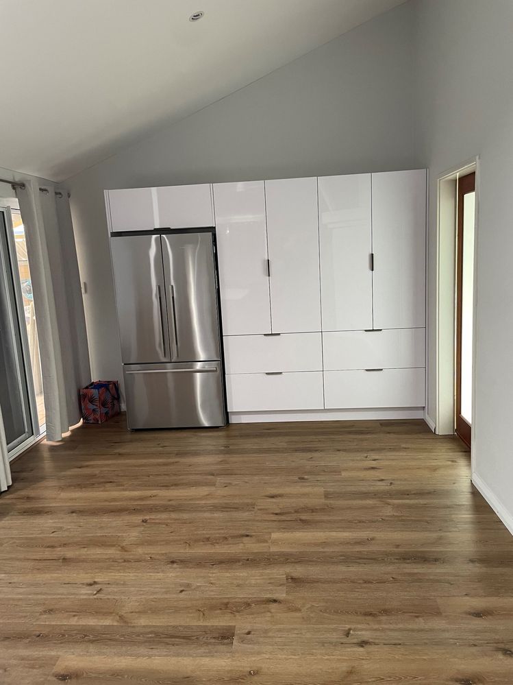 laundry is next demo completed and services first fixed.Floor tiling complete waiting on cabinets flat pack then stone mason and then second fix sink and toilet. Floating shelves near door. Currently preparing for painting before cabinets arrive.