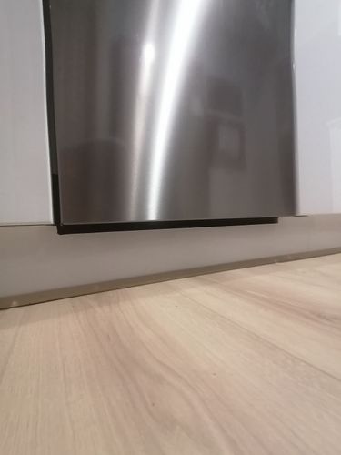 Measures down for clearance which will usually be around 20mm and cut notch out of kick board, then fit attach board with screws through cab by measuring in. Bingo bango, your dishy looks swish and you toes will be in one piece.