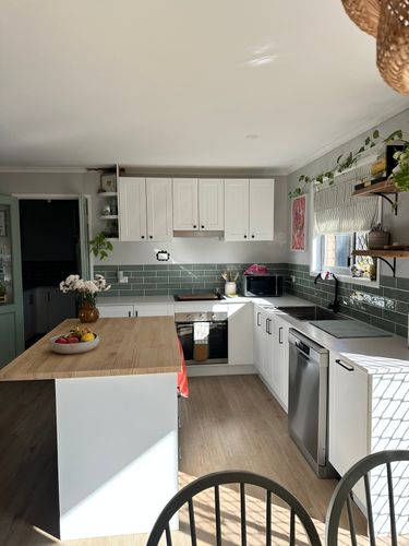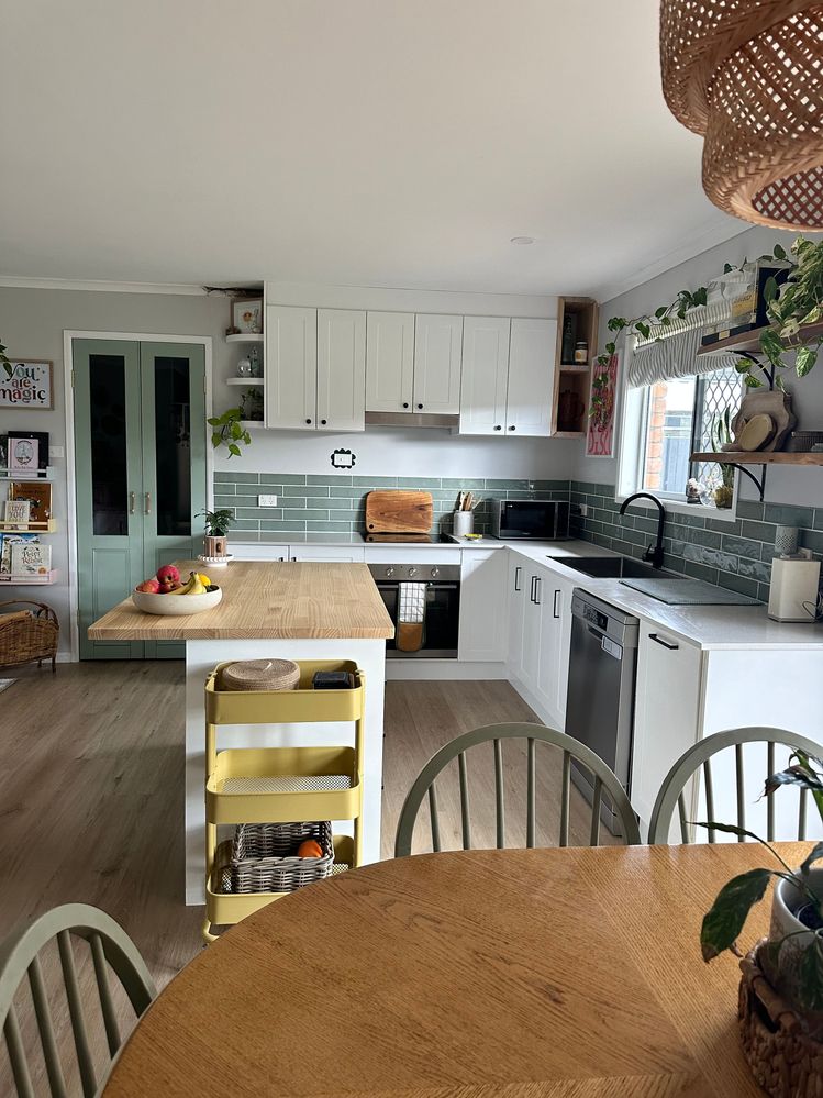 I'm a big fan of the island benchtop and the green tiled splashback. They give it a great modern look with lots of light and plenty space to cook and enjoy time with your loved ones.