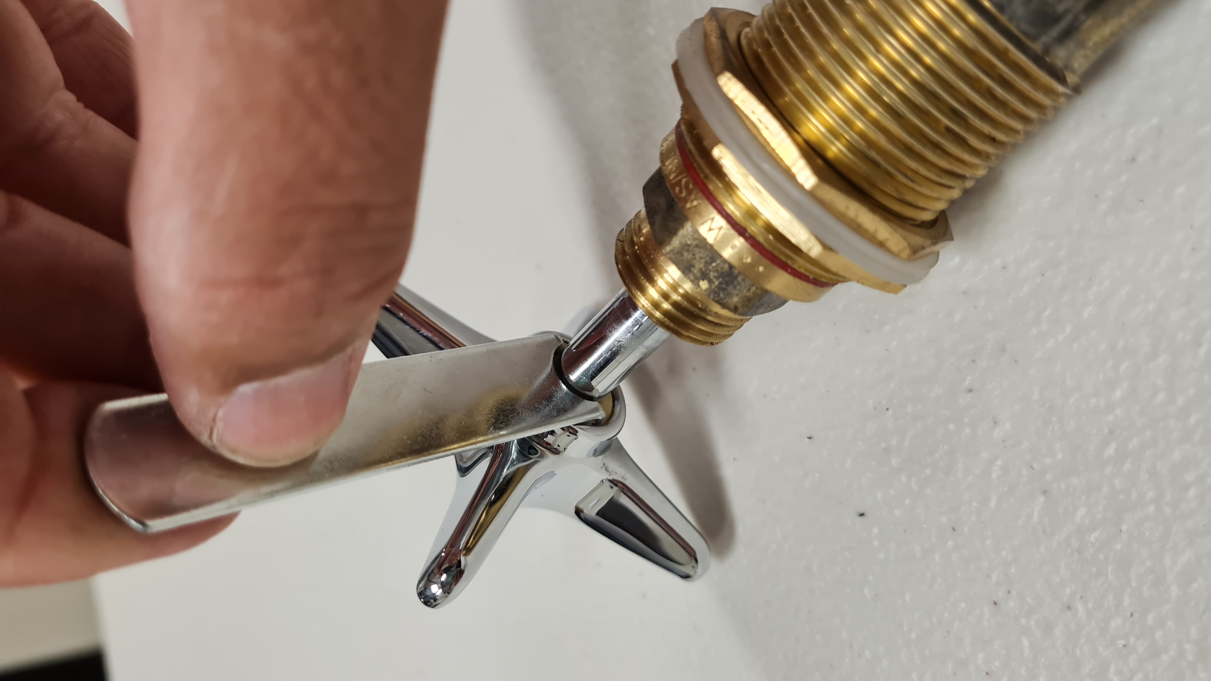 However, in order to service the spindle, the handle must be removed first. I've placed an image below to give you an idea of how to remove the hidden nut behind the handle. You'll need the two-pronged tool from the Kinetic Spout And Handle Repair Kit.
