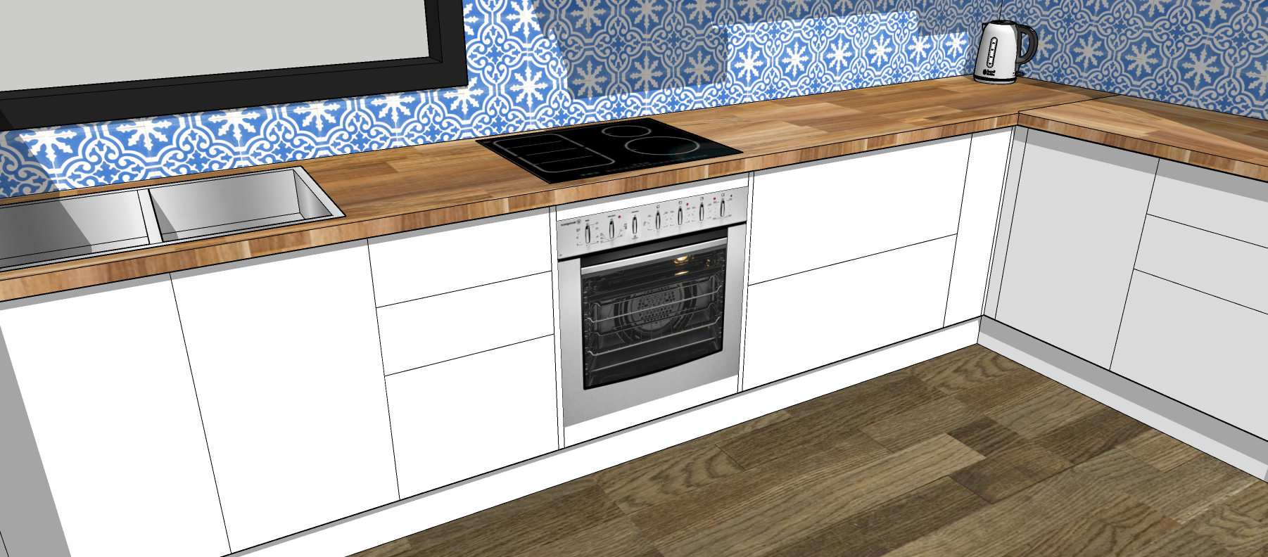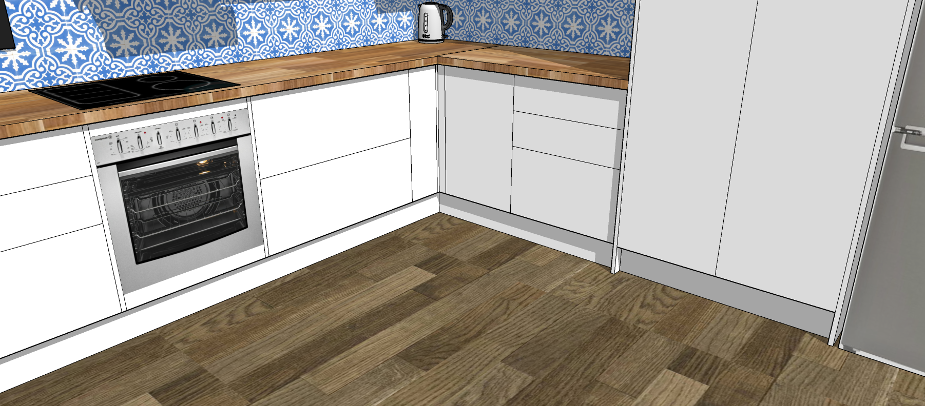 CURRENT Design: wall, END PANEL, base cupboard (for the sink), dish washer, base cupboard.