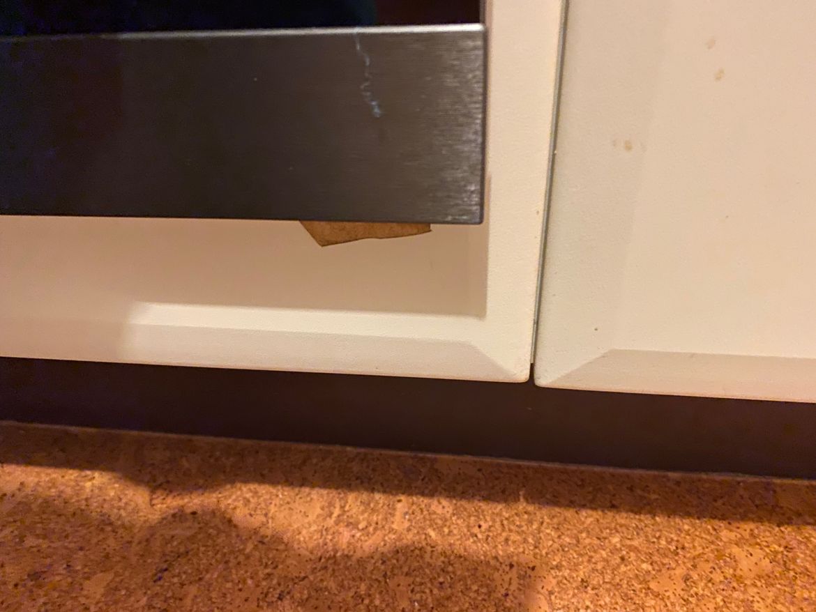 however, more recently, I had a local electrical store deliver an oven as my old one died on me. Whilst removing the old oven, the guy chipped off a small bit of laminate on the bottom asper the pix attached. instead of passing it over to me, he threw all the rubbish into the garbage bin. So I have lost that bit. Pl refer uploaded pix. Can I paint that area rather than use a product to iron on as suggested by another member of the community with a laminated door problem. Pl advise.