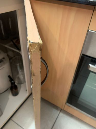 You could paint over that section, but since the MDF is swollen and the laminate is degraded, you'll get a fairly sub-standard result. Given the work involved in painting cabinetry, it would be worth the extra time to repair or replace those cabinet doors. You could achieve a reasonable repair job by sanding back the swollen area until it's flush with the rest of the door. You can then fill the chipped laminate edges with Builder's Bog and sand it back to form crisp corners. Once everything is looking good, you can use the laminate primer and then paint your cabinetry. Alternatively, if repairs sound like a bit of work, you can take your door into the closest Bunnings store, and a team member can assist in finding a suitable replacement.