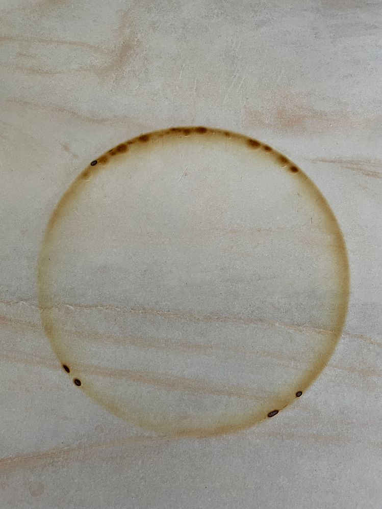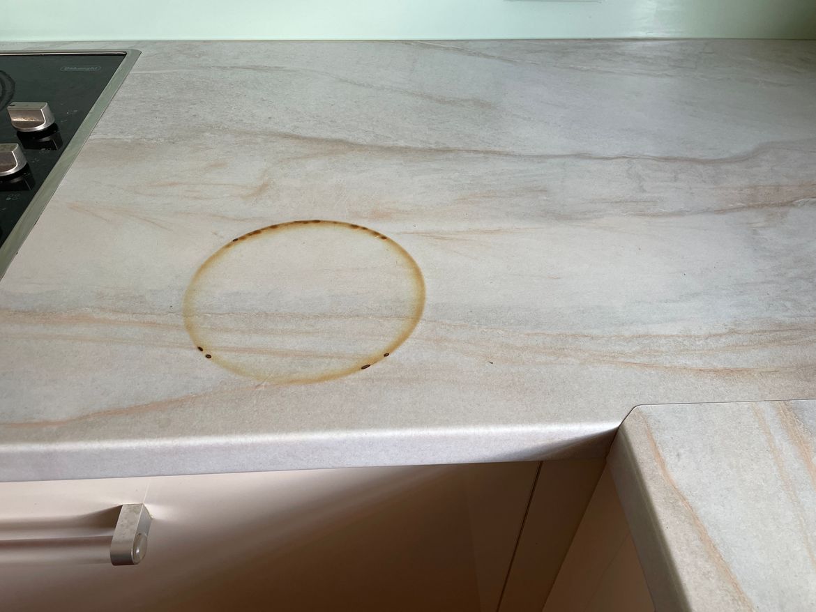 The mark is approximately 17 cm in diameter and was caused by a hot pot. The surface is a light-coloured laminate.