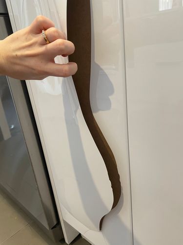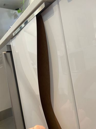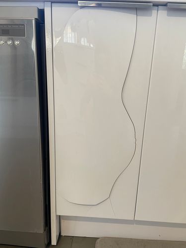 The most straightforward solution, especially since the damage is extensive, is to replace the door entirely. If you can determine the manufacturer of your cabinetry, you might be able to order a replacement door that matches the original style. In some cases, brands like Kaboodle may offer doors that fit or are close enough in style, which could save time and effort. If a perfect match isn’t available, you could also consider a custom door, but replacement is generally the best way to restore the cabinet’s appearance.