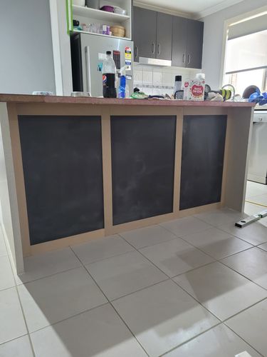 The cupboards and kitchen island were painted with White Knight Renew primer and then the too coats were done with Dulex Renovation Range (Natural White) to brighten it up.