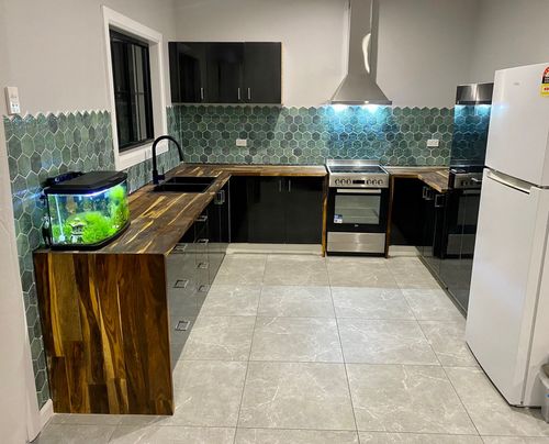 At the tail end of renovating the family Queenslander at the moment had a new kitchen installed upstairs but instead of getting rid of the cabinetry I decided to re-purpose it downstairs and turned it into a kitchenette. Did everything myself, dismantled and rebuilt the cabinetry to fit the area downstairs, re-sprayed the cabinet faces with 2K paint, cut and fitted the bench tops, tiled the floor and the splashback, cut out for the sink and installed that as well as the mixer and even mounted the rangehood and framed around the window. I’ve got no qualifications under my belt I just figured it out as I went and I’m pretty pleased with it to be honest. The photos attached are (in order I think) what the area looked like when I was starting to reshape the cabinets, then a photo of the original cabinetry how it looked upstairs prior to dismantling it and bringing it downstairs and then finally the aftermath of my work.