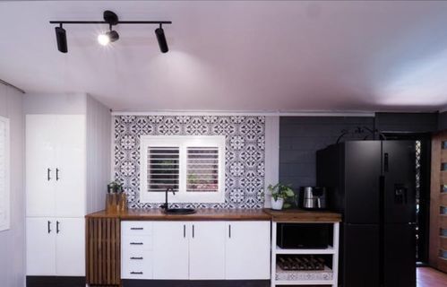 Using the old bones of the sink and underneath cupboards i painted in the renovator’s range white, added a bunnings timber top $79, bunnings black handles and a Woolworths black granite sink $79 and tap $56, I bought a 2 pac pantry off marketplace for $100 and boxed the top to the ceiling and walls using vj panels from bunnings painted in lexicon. Tiles were the most expensive $330 from tile shop imported from italy and bunnings grey grout. I used a bunnings large duck board hinged vertical to hide my bin and island bench to extend the length of bench too from kmart $120. Got electrician to move power points and install my black ceiling lights from beacon lighting. I used a handsaw, woodglue, no more gaps, paintbrush and determination to complete. Unfortunately i didn’t get to finish my cornice due to sale.