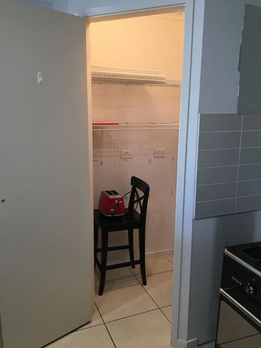 Opening up the cupboard for use as a butler's pantry is a great way to utilise what little space you have.