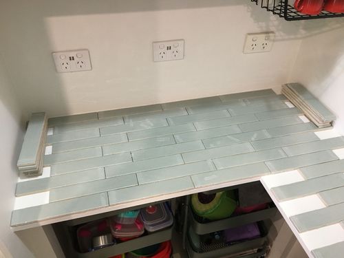 The Kaboodle cabinets look great with a few coats of the Spanish Olive paint, and I love the tiles you've used on the benchtop.