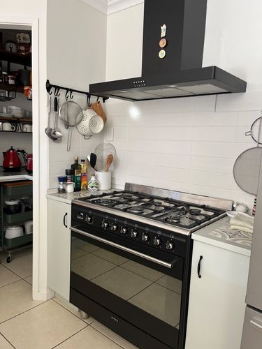 Removing wire shelves from pantry. On the right hand corner you can see the raw gyrprock where we removed the top cabinets, and below, the new Smeg 90cm cooker already delivered.