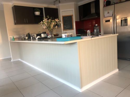 I'm waiting on my 63mm easyVJ panels to arrive to do mine. I have been throwing around ideas re batten cladding, bamboo, etc however given our Oak overhead cabinetry and dark splashback are already a feature we didn't want this to clash/overpower so will paint it Polar White to match the ground level cabinetry and contrast a little against the stone.