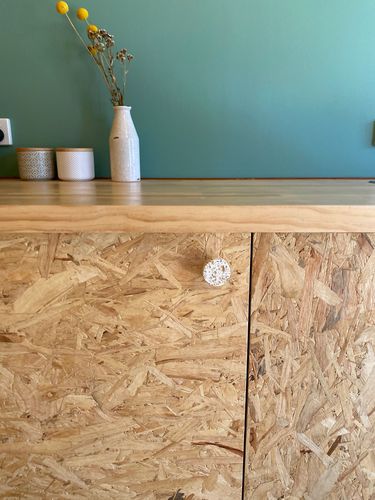 We made these door fronts using some off cuts of OSB leftover from the wall paneling. We were a little unsure how they might turn out, but are really happy with the end result.