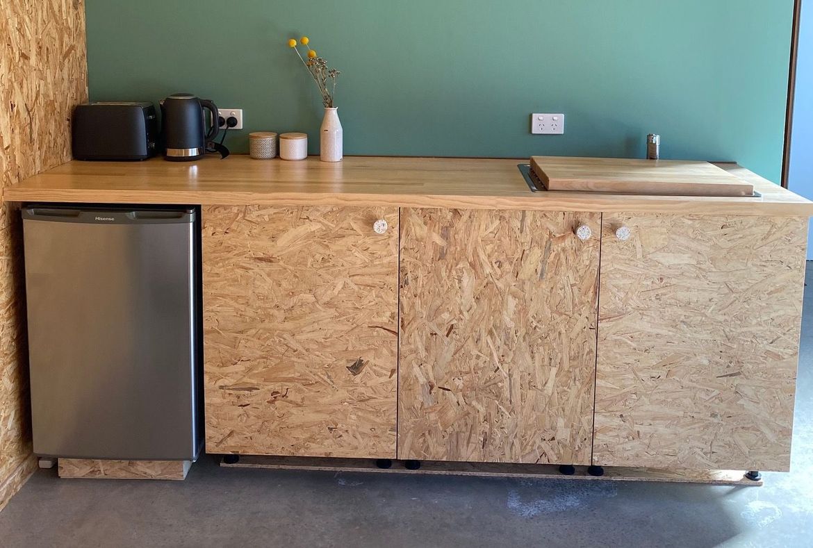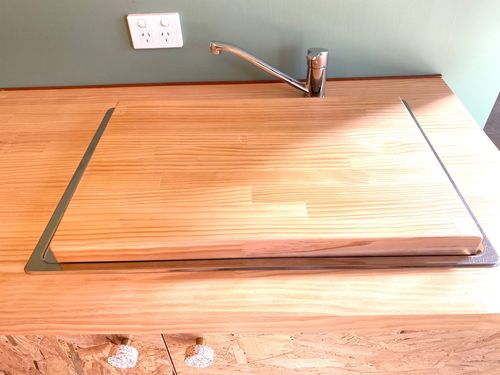 The bench top is pine laminate panel was purchased from Bunnings. The big butchers block/sink cover to add a little extra bench space is just the sink cutout that we couldn't let go to waste either.