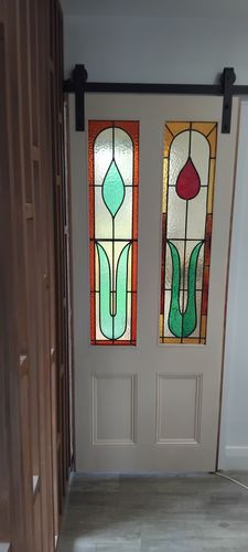 To go from a worn-out, boring old door to a fantastic stained glass barn door that would be such a wonderful feature in your home is just awesome to see.