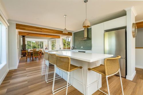 When we started designing the beach house we really wanted it to have an open house sort of feel. Backing onto the ocean the beautiful breeze in the summer comes flying in the back windows and I wanted to be able to enjoy that from the kitchen. Being a holiday house I needed the kitchen to be really functional and store the basics. I wanted to hide the microwave in the pantry so we had to increase the width to the 900mm tall cabinet which proved very successful. The middle bench is a great meeting place filled with 9 huge drawers. To finish off either end of the island bench we used Vj panelling which really tied in to the rest of the home.