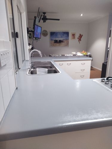 Kitchen was so drab , colours were unappealing, so off to Bunnings to decide on new colour schemes...from salmon pink cupboards and green benchtops to crisp white and Dulux Malay Grey