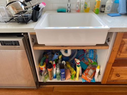 Looking to freshen up our kitchen and unfortunately it’s been in a semi renovated state for a while. With a baby we need to cover this area but the previous cabinet doors no longer fit (due to the farmers sink). What options would you suggest to cover up this area.