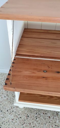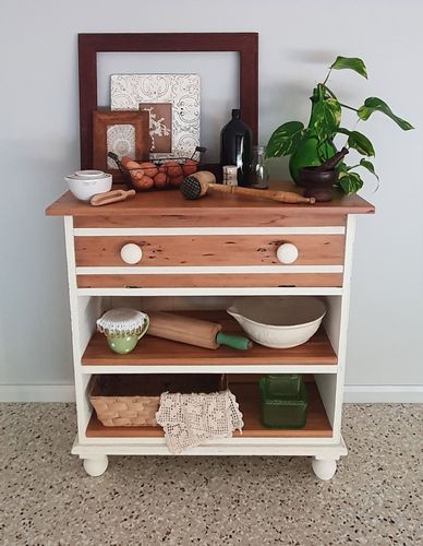 So I stripped and sandered back the top draw. Found an awesome piece of timber slab to use as the top. Recycled bed slats as shelves. Painted and then distressed the rest of the cabinet and it turned into great usable farmhouse display cabinet work bench. It was a very rewarding project.