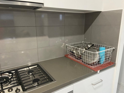 We will consider other option of 'Wall art panels' in front of 'grey tiles'; That might consume 3 to 4mm space around the bench top; From safety (fire) point of view to explore more on using the 'Wall art panels'