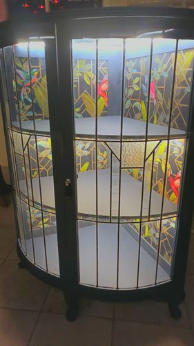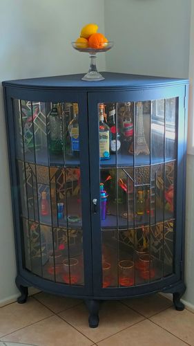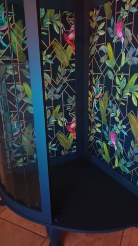 Thank you very much for sharing such a wonderful story about your art deco cabinet. I'm glad you decided to give this piece a second chance to become useful again. It would have been a shame to see it go to the tip. Porters paint is top notch and the photos don't do it justice, I've seen the yacht race colour the finish is probably gorgeous. The wallpaper and the lights really add to the personality of the cabinet. I'm glad you managed to save the original glass fronts.