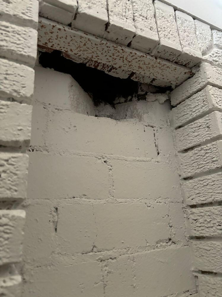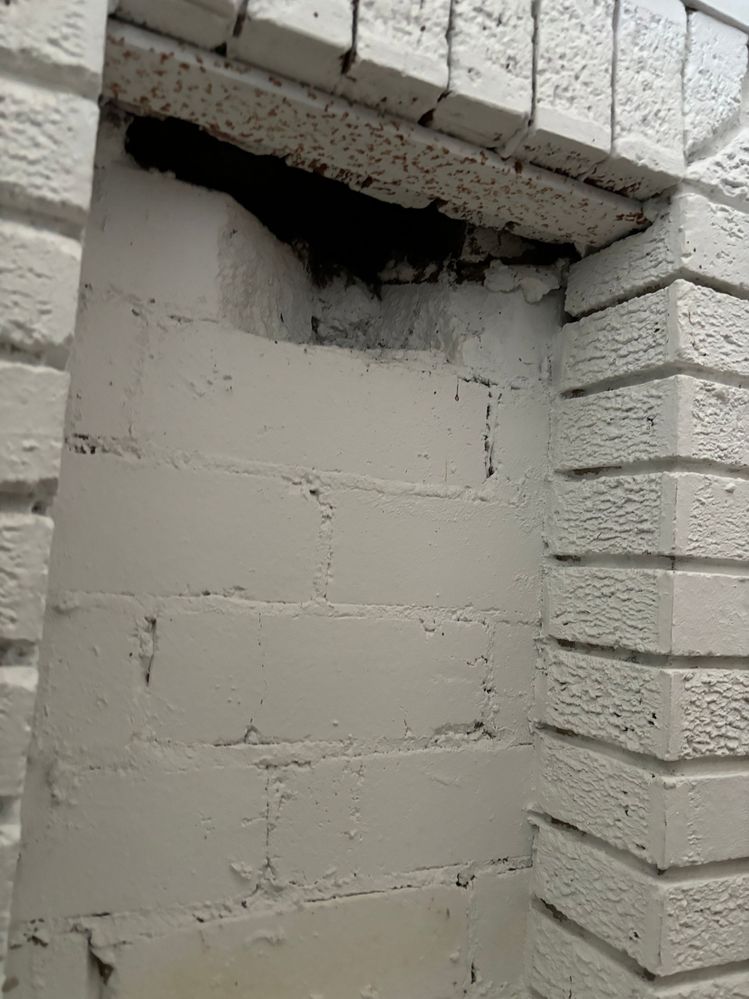 We're in an old apartment built in the 70s and there's a strange fireplace/mantel that doesn't actually work. I can't tell if it's been bricked up or was never functional - but have recently discovered this gap in the top that is filled with heaps of gross black dust.