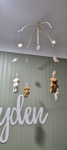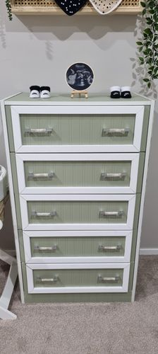 Together my partner and I designed and made over our first baby's nursery room. We love to DIY and live in between 3 local Bunnings stores, which is super handy! I designed this accent wall using Bunnings molding and superfresco easy paintable textured beadbord wallpaper. I'm so happy with how this wall turned out! It just gives the room a lively fun feature. My partner with his tradie skills assembled the wall and the paint colour we used was called olive spring. Our baby's name on the wall was also something we hand crafted with a sheet of MDF board, jigsaw and lots of hand sanding! The dresser was an old plain white set of draws which we refurbished to match the feature wall. The baby mobile and wall decor are all items I made myself. And lastly the wall sconce lights are another feature we hand made using items from Bunnings including, wall mounted Carinya Natural pine brackets and battery operated down lights!