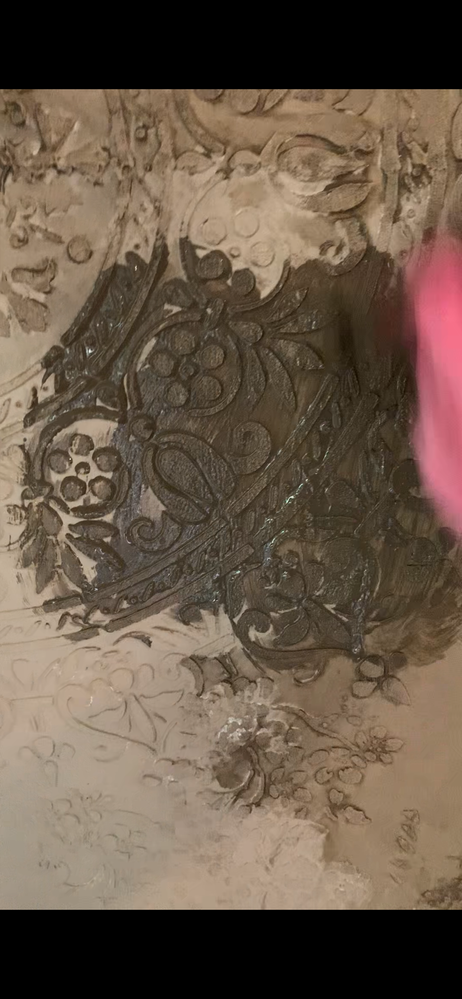Although I don't have lots of photos of the next bit, I used some dark watery paint to wash over the base colour, then wiped a lot of it off with cloths so it highlighted the pattern more. Then I added touches of subtle yellows and reds to create more different tones.