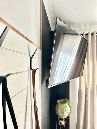 I wanted the wall to have two purposes, one side for the tv and one side to hang coats etc so to seperate them we hung the panels vertical one side and horizontally on the other.
