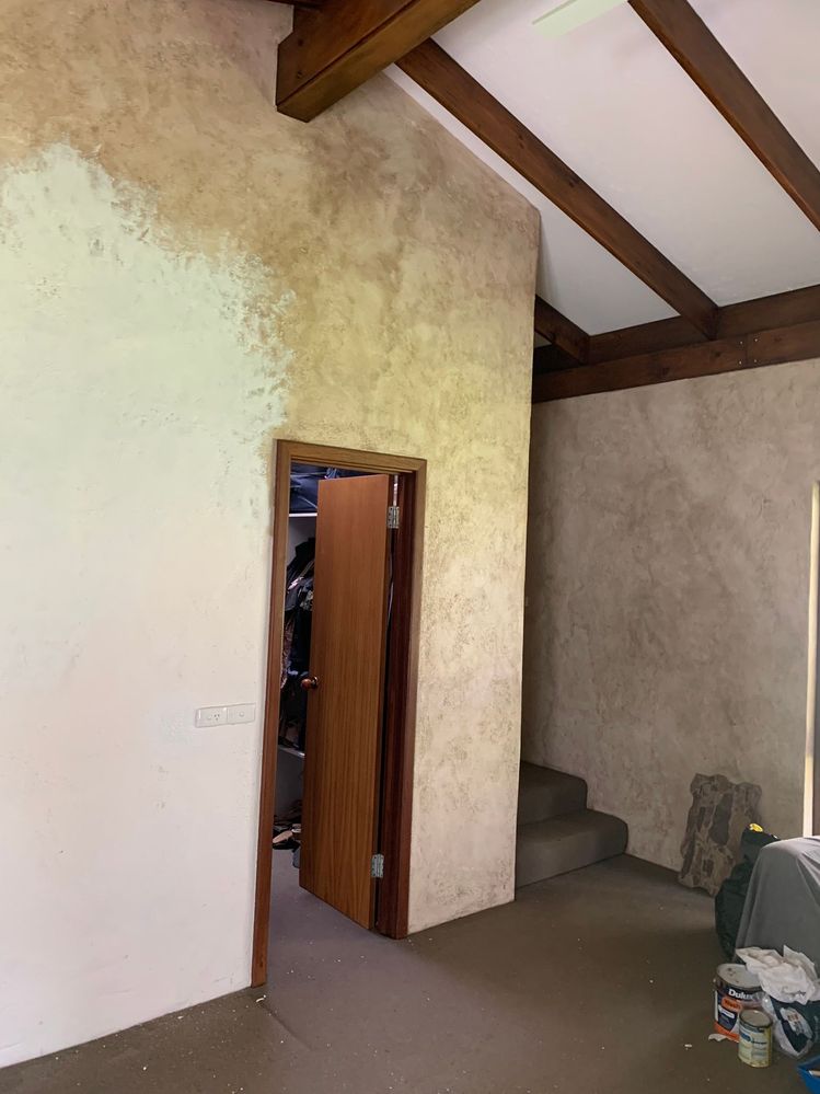 The 'sort of' before photos - didn't manage to get one before I started, but here's a few of the doors. One with the scaffolding when I was re-staining the rafters, and the other when I was putting a 'wash' over the roughly plastered walls to create an aged effect.