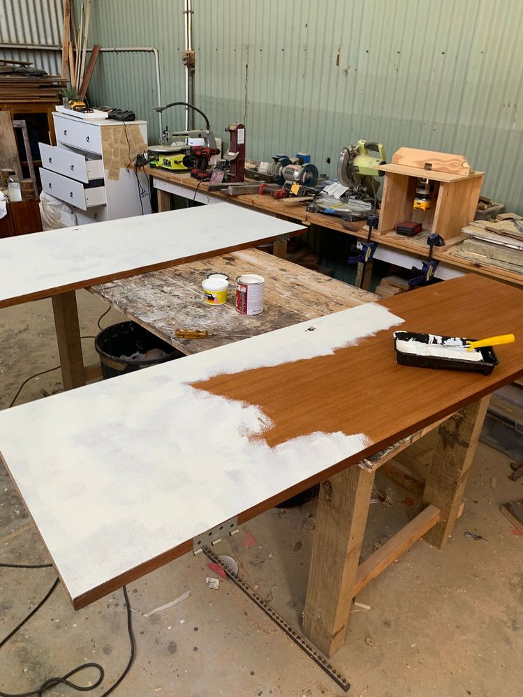 First thing to do was to put two coats of Zinsser BIN Shellac based stain blocker to prevent the jarrah wood tannings from leaching through the paint, both on the doors and frames.