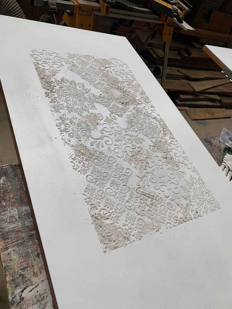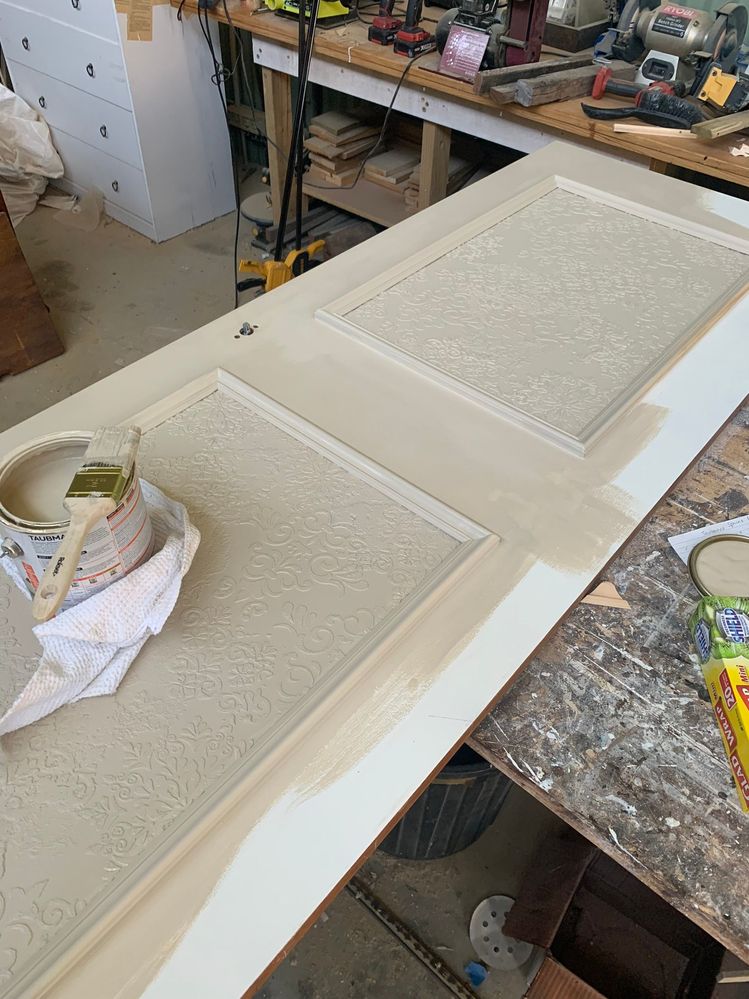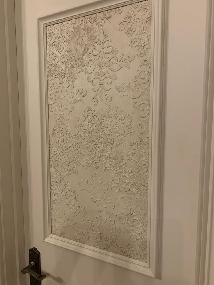 Next step was to masking tape my panels, and then using stencils and Joint Compound, create some raised textured patterns in the panel sections. Then given them a bit of a sand before framing the panels with some pine moulding.