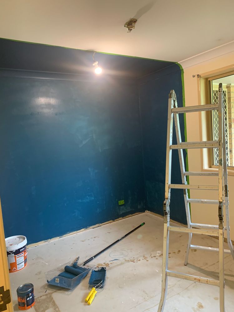 We start painting the walls and ceiling in a dark blue from Dulux.