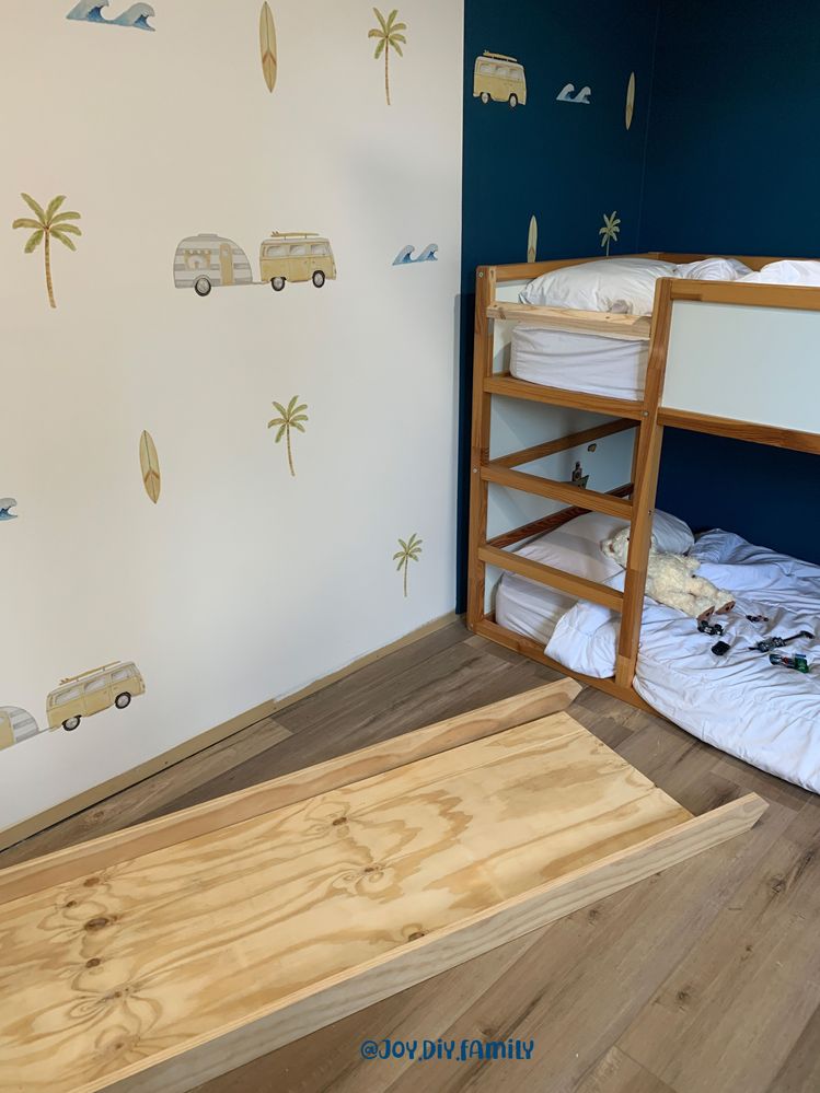 The boys already had this Kura bed from Ikea, this time they wanted a slide that we put on top of the ladder, so to climb the wall we created a climbing wall on the corner of the room. We created a niche painting the walls/ceiling in a dark blue colour. We painted the climbing rocks to match with the sticker we already had. We replaced the carpet for a hybrid flooring and replaced the ceiling fan and lighting.