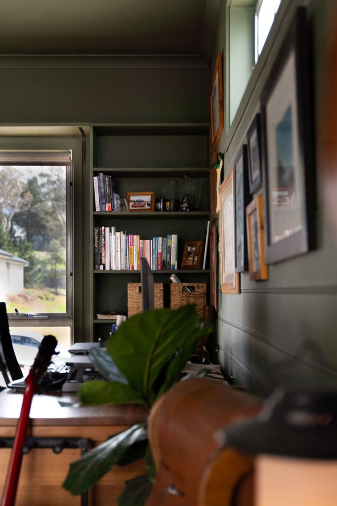 While our off-the-plan house was being built, I dreamed about creating a colour-drenched, moody space to work and be creative in. Months into moving in (and newborn in tow), it was so fun and rewarding to bring this white, narrow room to life. It's taken a lot of work in between feeds... lining one of the walls with panelling, building bases and shelving for in-built cabinets, installing a roller blind and new light fixture, upcycling a solid timber desk and old lamp with new fabric, sourcing secondhand frames for the gallery wall, and painting every wall including the ceiling!