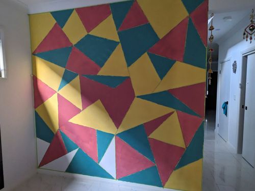 Newbie here. I am planning to colour our living room wall sized 2.6m x 2.6m with geometric shape, pretty basic random triangle pattern. I would like to use 4 pastel colours to fill in the patterns. I already have a 10l Taubmans interior paint white coloured.
