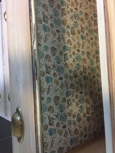 Paint stripper, paint, varnish, sanding paper, drawer handles, whitening stain and varnish, shelving paper