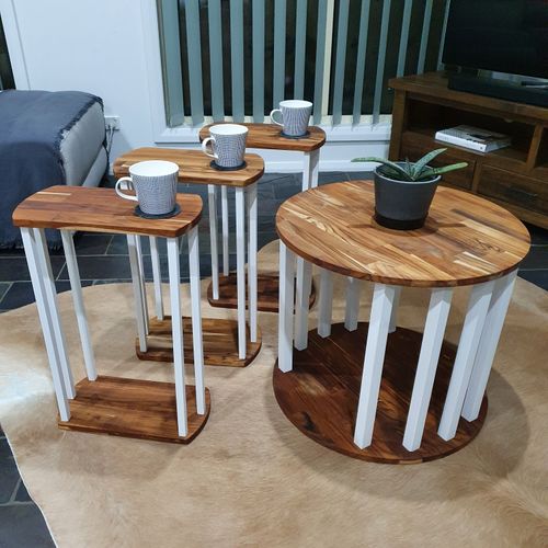 Shop doesn't sell what you're after and anything close costs a bomb? Just make it. Inspo from a plant stand and of course, Bunnings! Coffee table and 3 side tables.