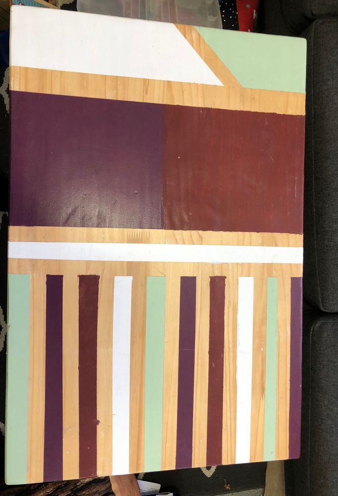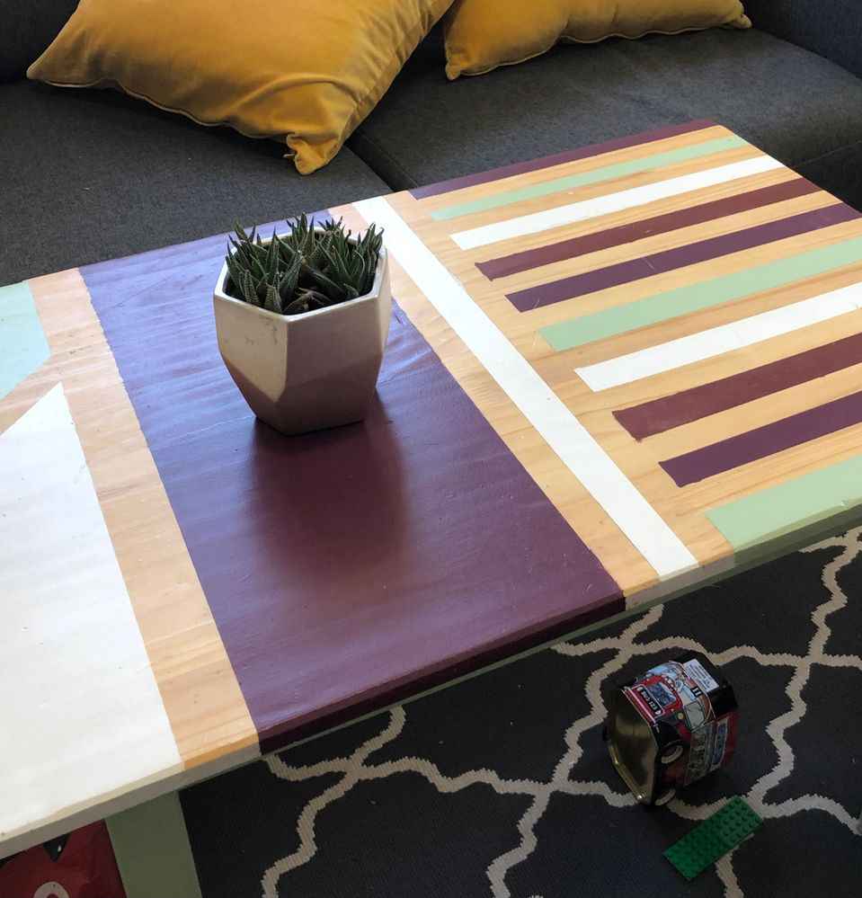 We sanded it fully and then I had the boys make their own 'line' design using masking tape. We then used a variety of paints we had in the cupboard to bring the design to life.