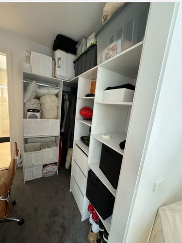 Hi I am trying to set up a study in my walk in wardrobe. I need to cover the shelf’s behind me for video calls. I was thinking doors or blinds or curtains. It’s a L shape wardrobe what can I buy and install that’s not too hard or expensive. Ideally roof to floor cover but not mandatory