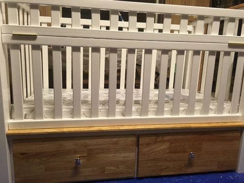I told my wife before the birth of our first child that I'd make all the nursery furniture. No idea why, just on a whim, with no experience in woodworking she though it was a bit mad Since then I've kept my word. This is the cot i made. It has two drawers the width of the cot which Is enough room for all the cot linens and blankets.