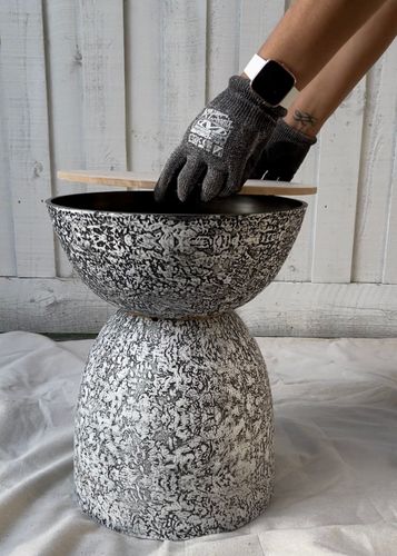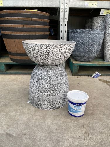 I glued 2x Northcote resin planters with liquid nails, cut out an MDF round, spray painted it white & slathered Selleys white grout (mixed with a little bit of Dulux Berkshire White) all over it.