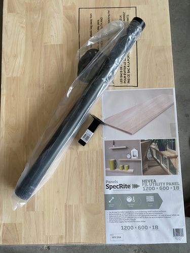 Using the laminated Pine panel 1200 x 600 (Stained with classic grey and walnut), 3 x 700mm black round furniture legs, 2 x 100mm  25mm square legs and 2 cubed storage shelf, I was able to put this together pretty quickly. The legs are adjustable so easy to stabilise on uneven floors. Plus easy to take it apart so I could carry it upstairs and set it back up wherever required.